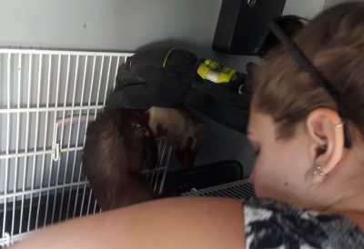 Met veel gepor in het hout en de medewerking van de melders heeft Sandra uiteindelijk heel snel de marter gegrepen en in het mandje gedaan. Inderdaad wat wondjes maar leek verder ongedeerd en is nu veilig naar de Fûgelhelling.