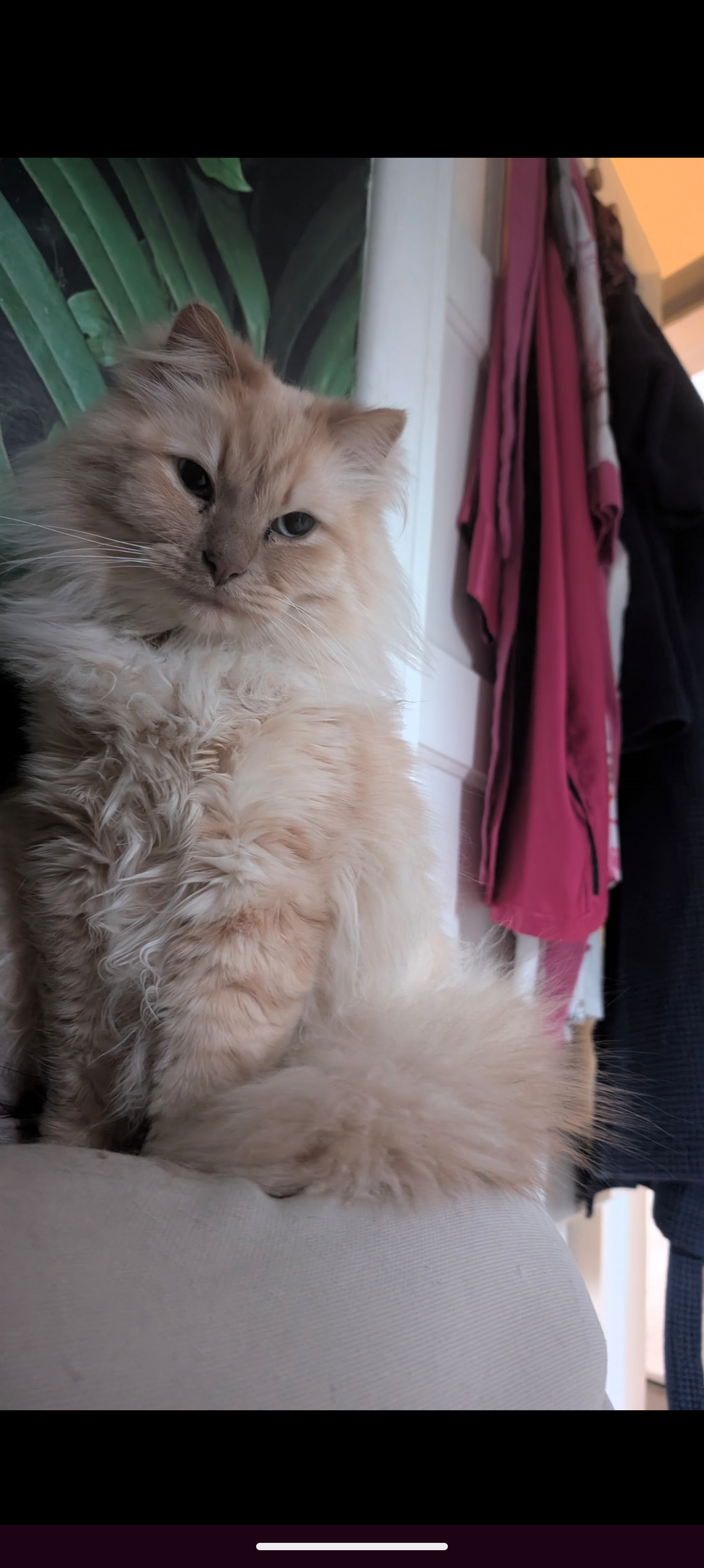 Mink Ragdoll, gecastreerd mannetje. Heeft een penninkje om met zijn naam en mijn telefoonnummer. Is gechipt. Wat schuw van aard in eerste instantie, maar zeer vriendelijk. Op avontuur uitgegaan vanaf helper westsingel. Vermoedelijk het idee gehad om over de schutting te klimmen. Is echter niet gewend aan het \'buiten leven\' en zit waarschijnlijk ergens verstopt.