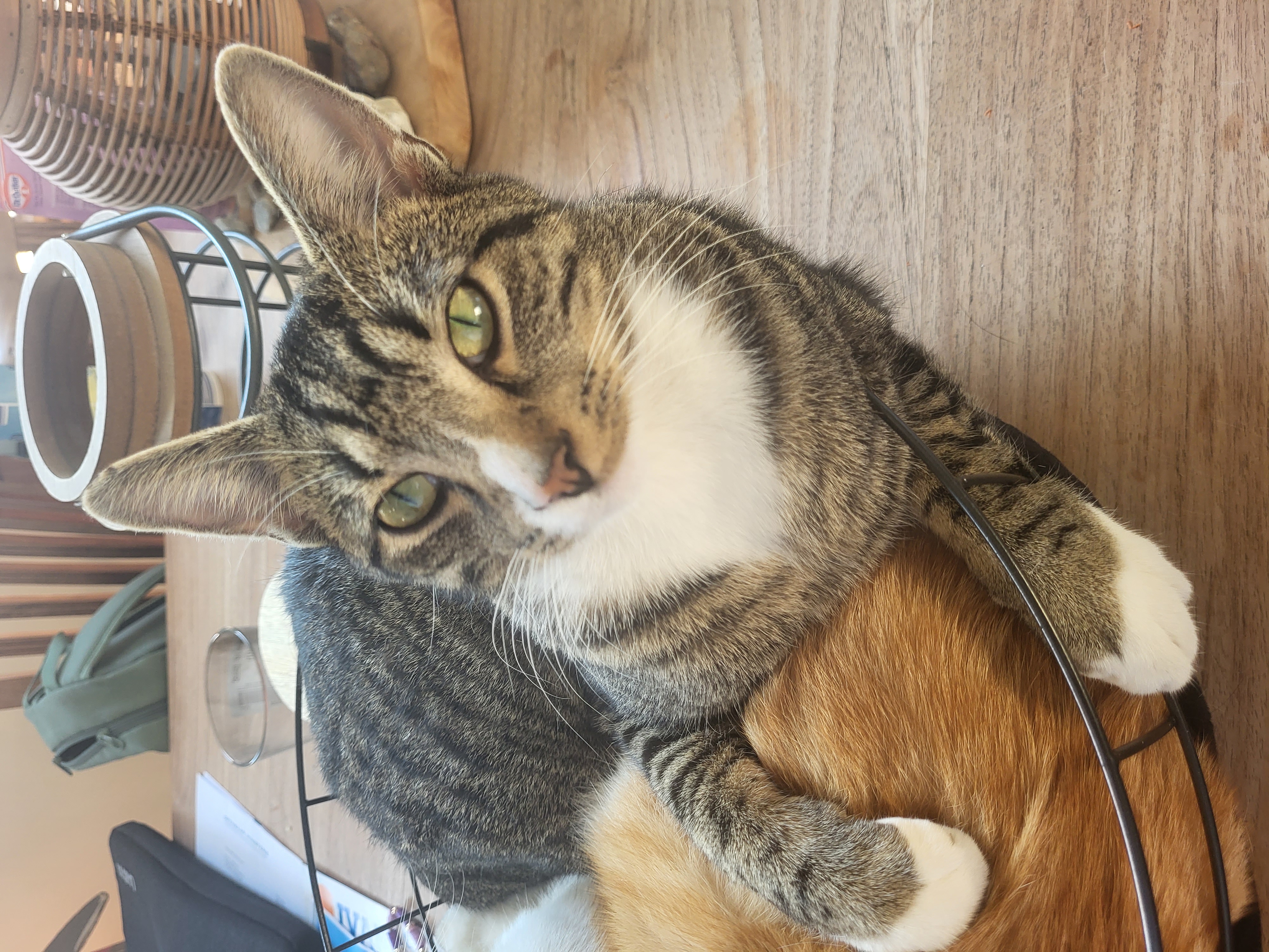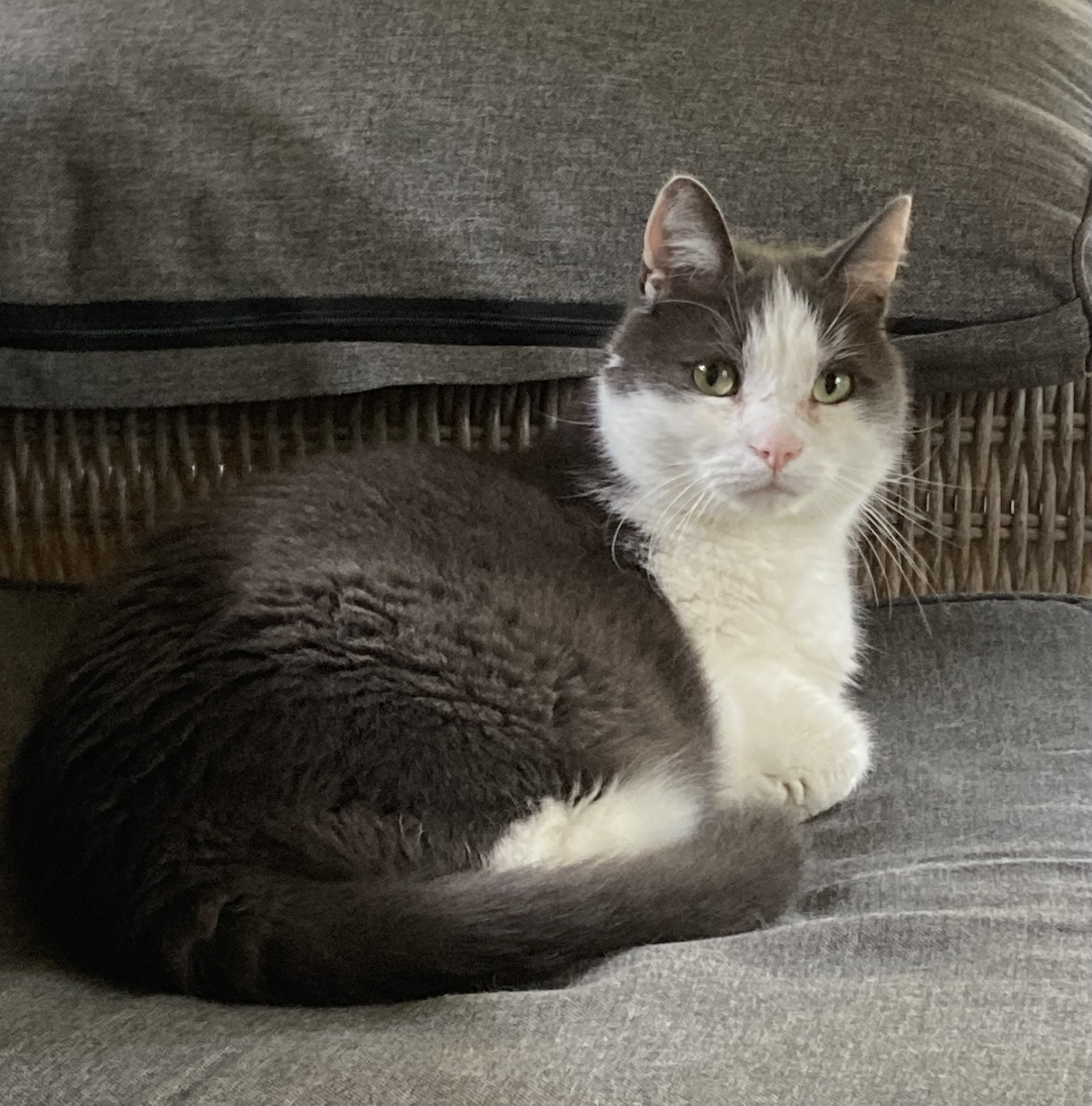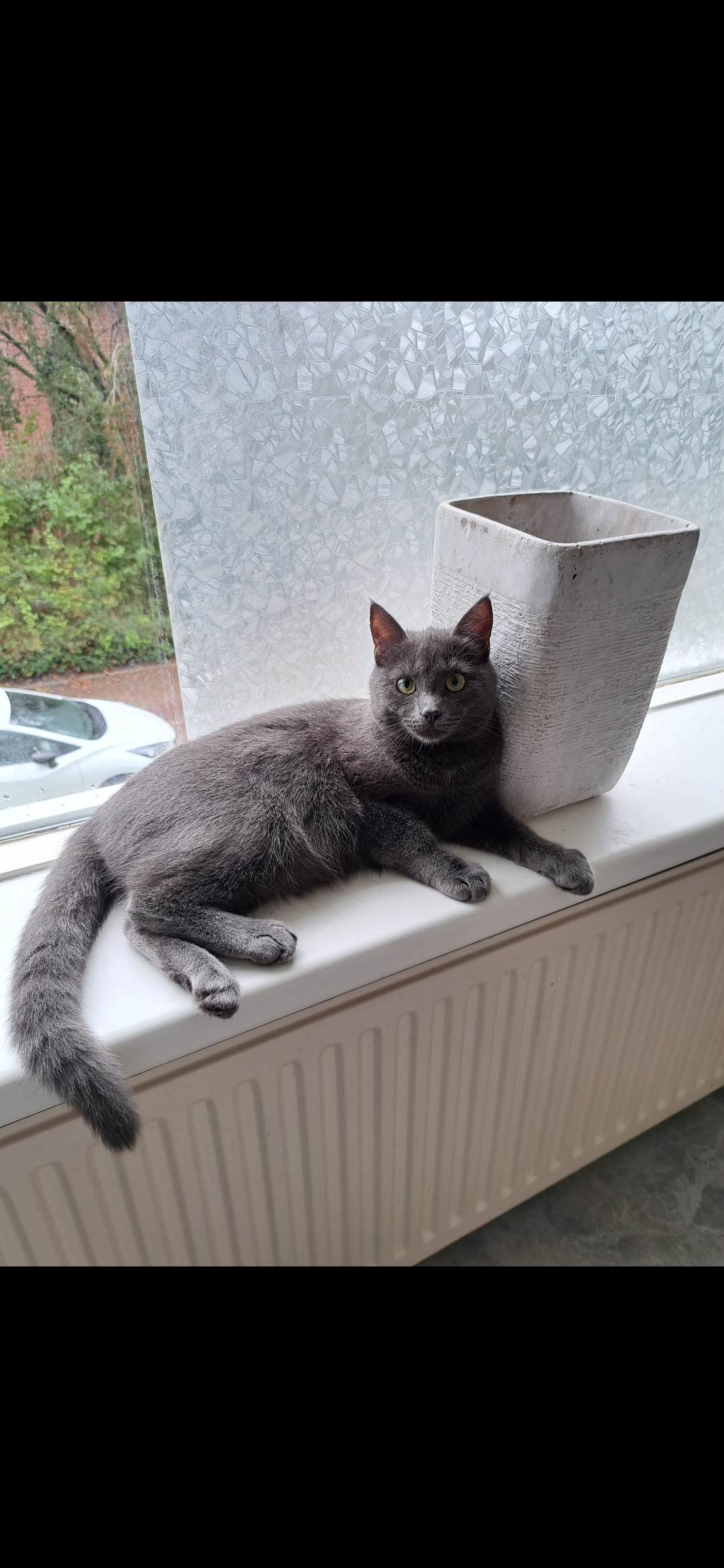 Finn is een grijze kater met een klein wit strookje op de borst en buik. Normaal gesproken vrij aanhalig en nieuwsgierig.