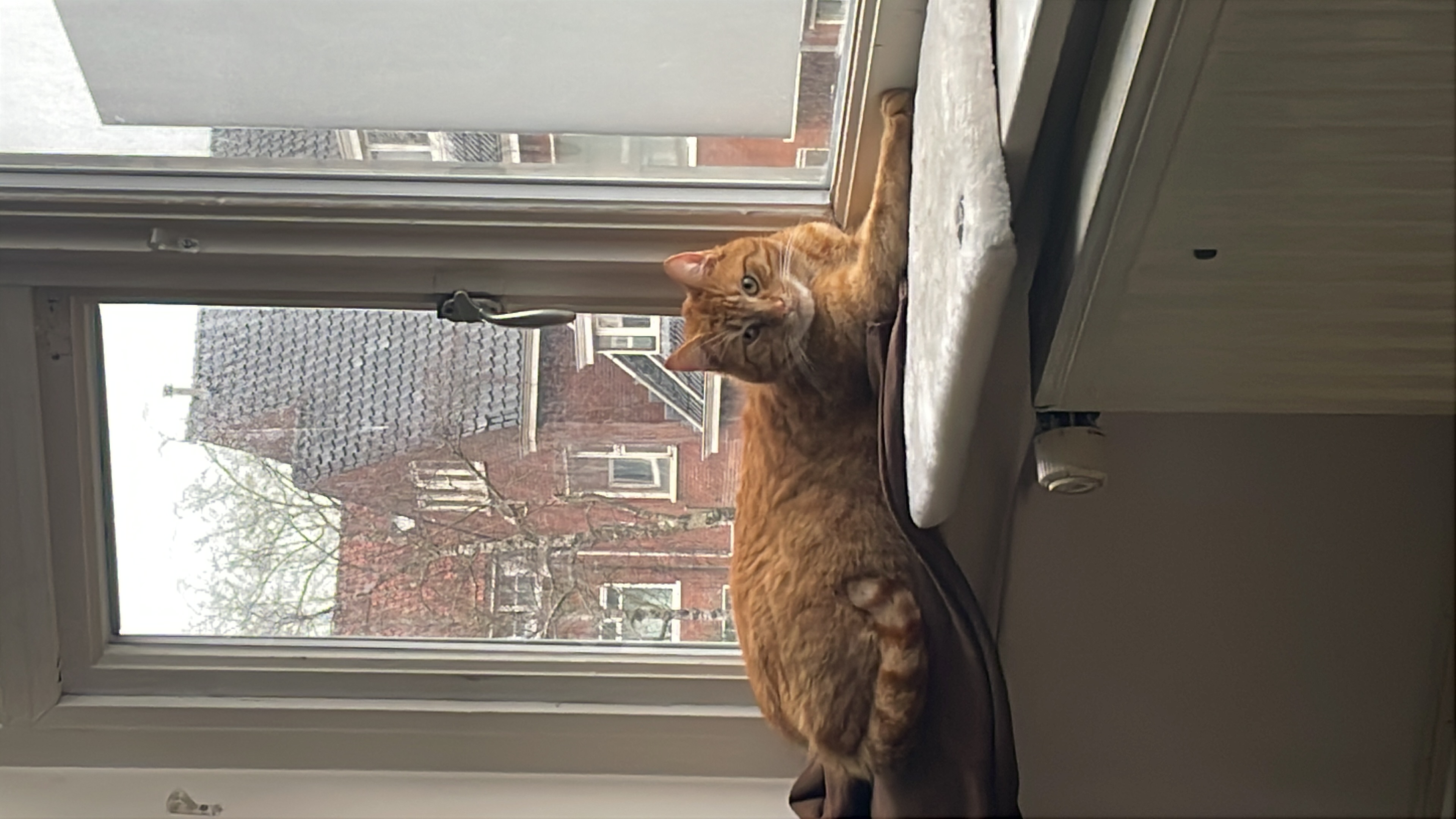 Rode kater van 2 jaar en 5.5 kg. Klein beetje wit onder zijn kin. Slank postuur.