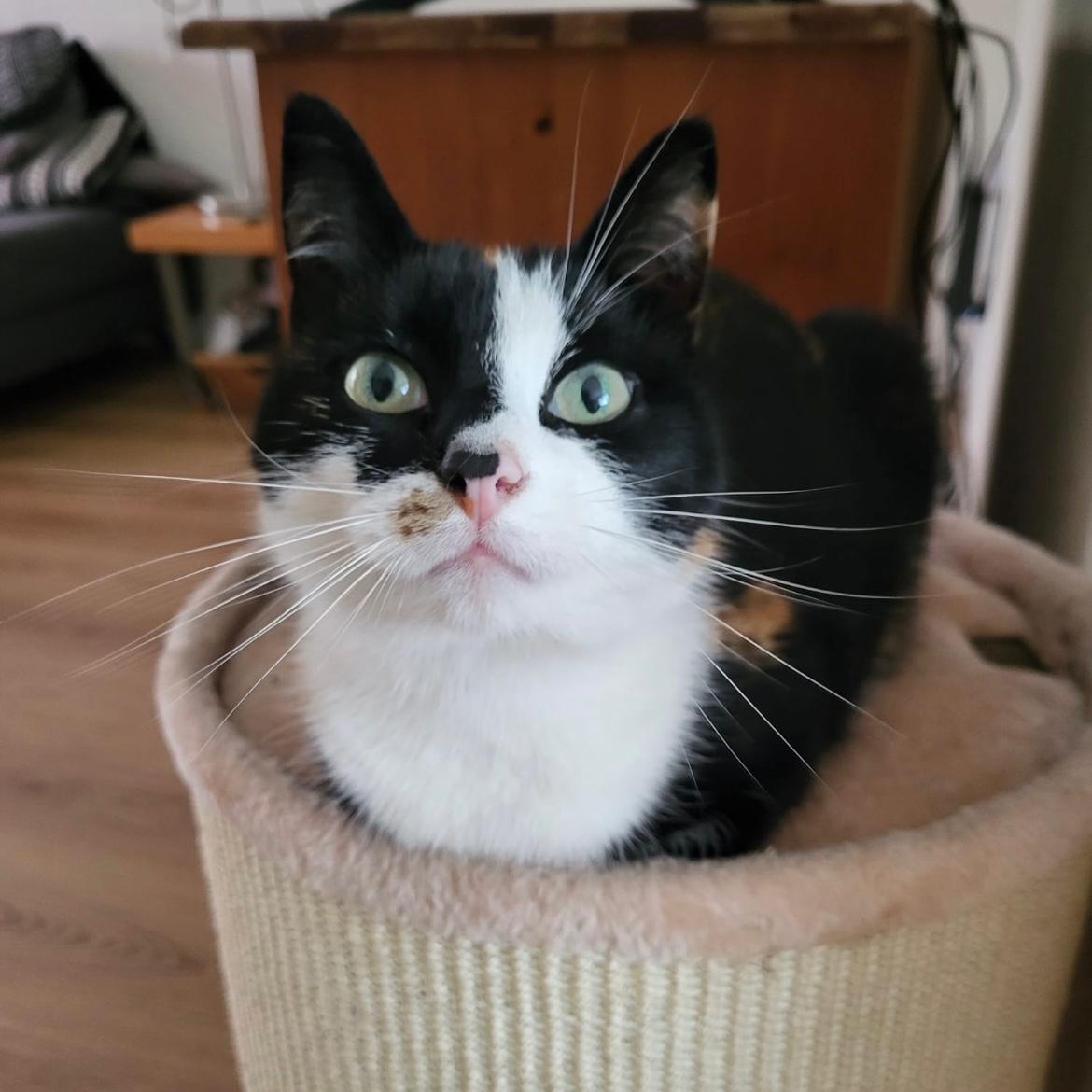 | Kleur: | Lapjeskat. Zwart wit en bruin |