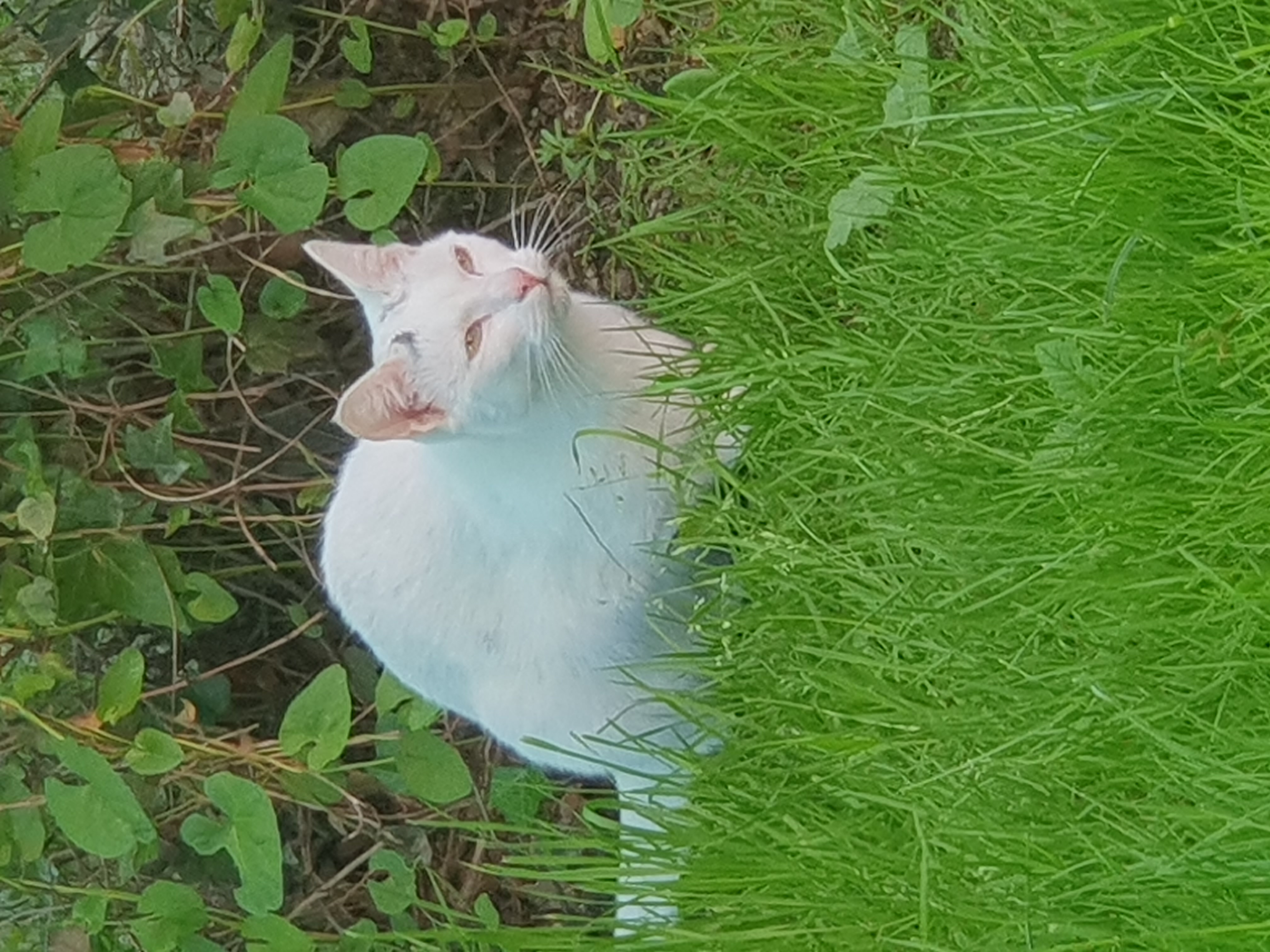 Klein wit poesje. Paar donkere vlekjes op haar kopje tussen haar oren. Klein donker vlekje op staart en aan de zijkant.