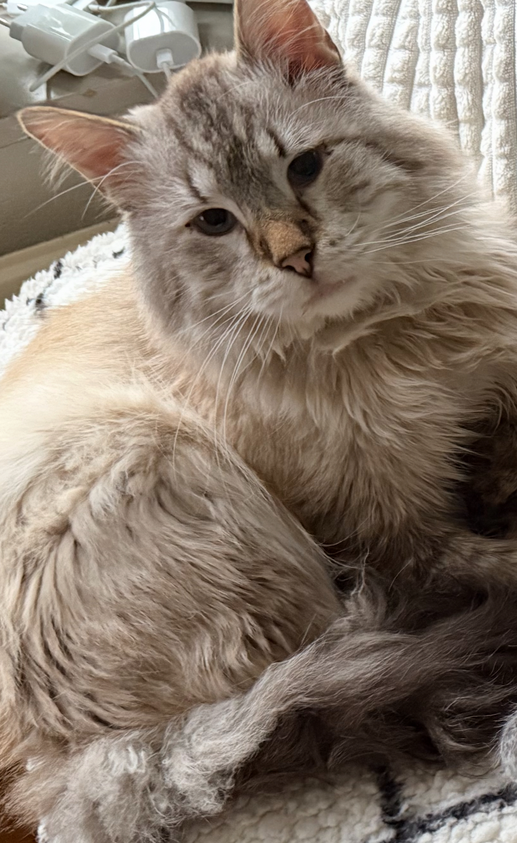 Angel is een lieve tikkie brutale poes en houd van aandacht ze heeft 1 crème voetje aan haar voorpootje en een crème bijna vierkantje op haar borstkastje ze gaat hele gesprekken met je aan ze is een echte kletskous.