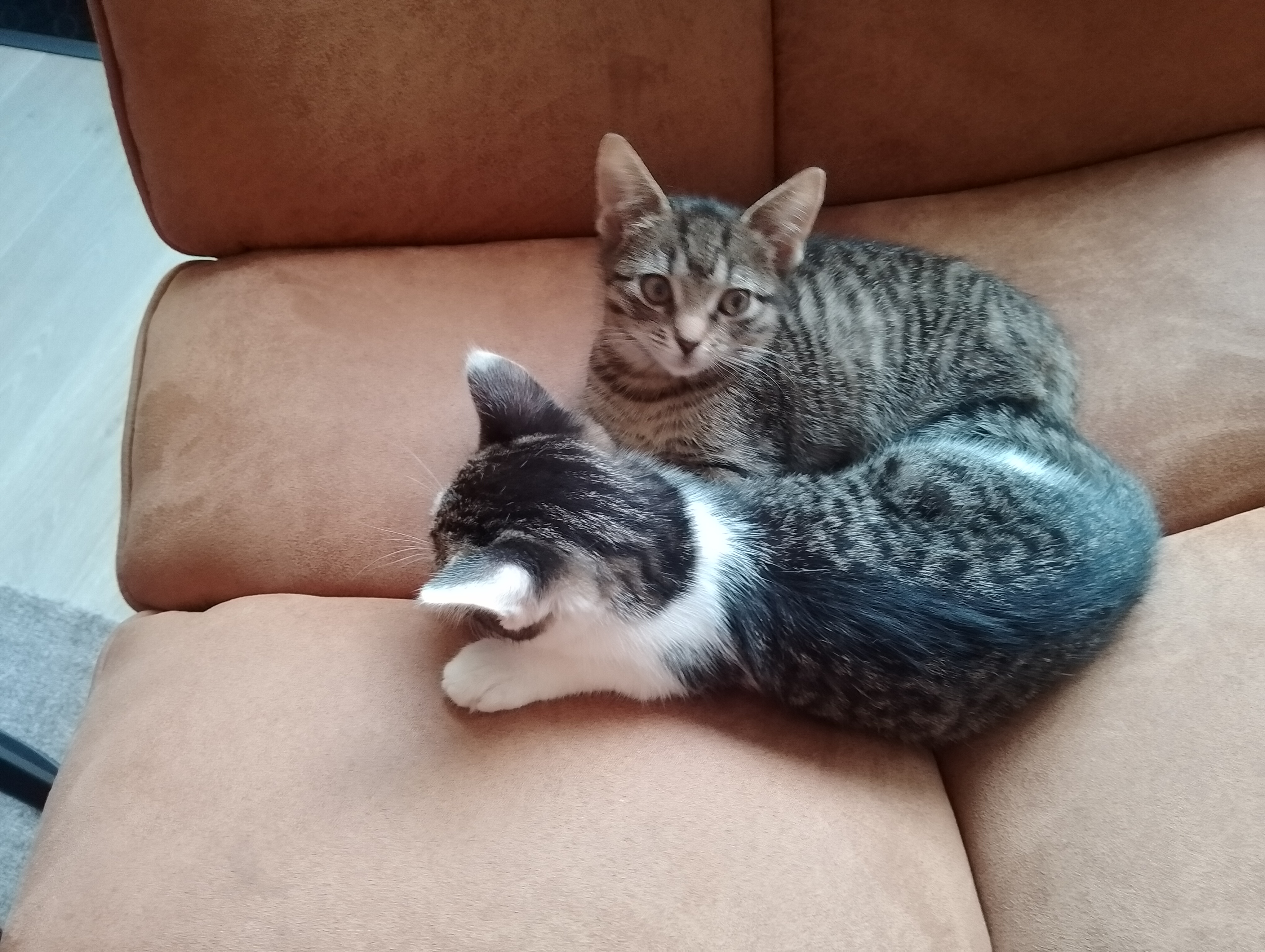 grijs / bruin gestreept met witte buik en witte pootjes. Hij is gechipt.