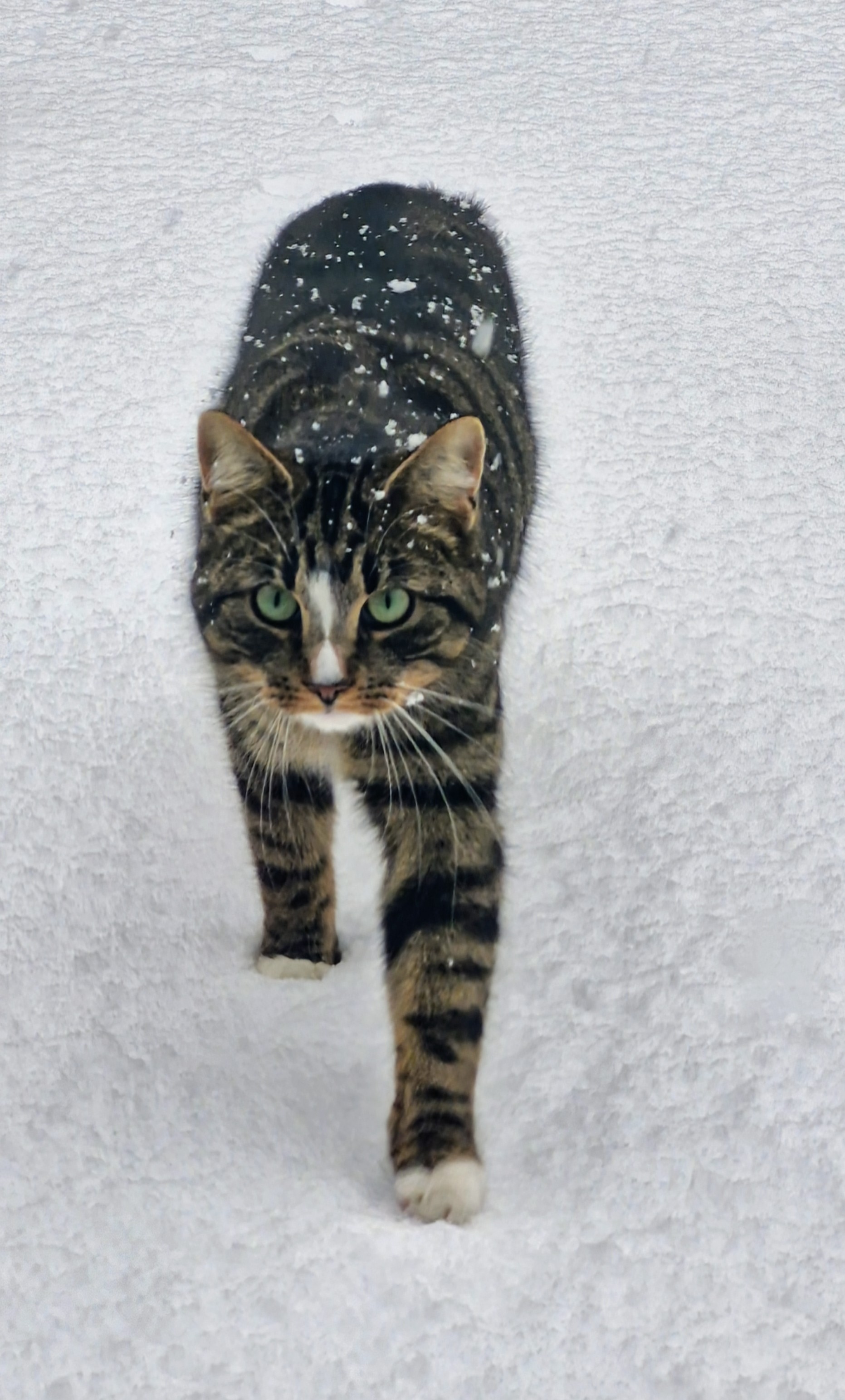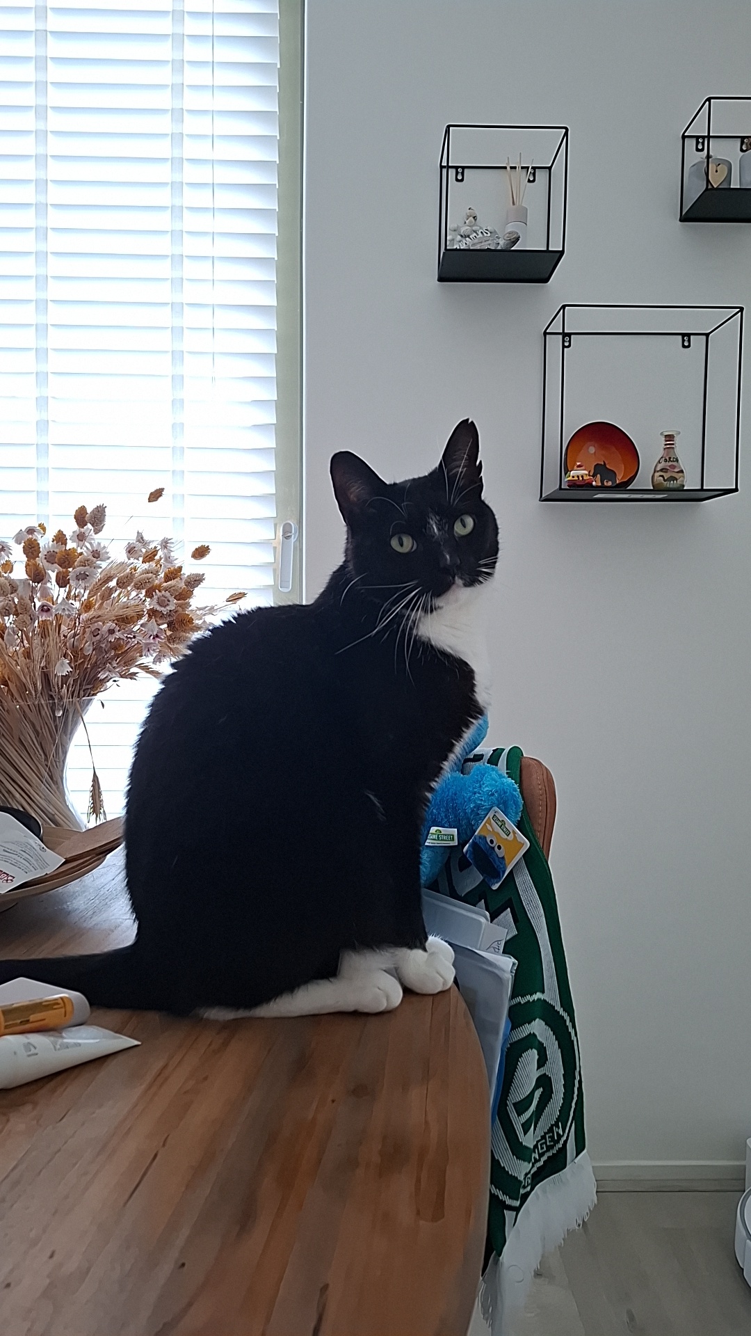 Zwarte kat met witte buik, hals en voetjes. Streepje op zijn hoofd. Bange kat