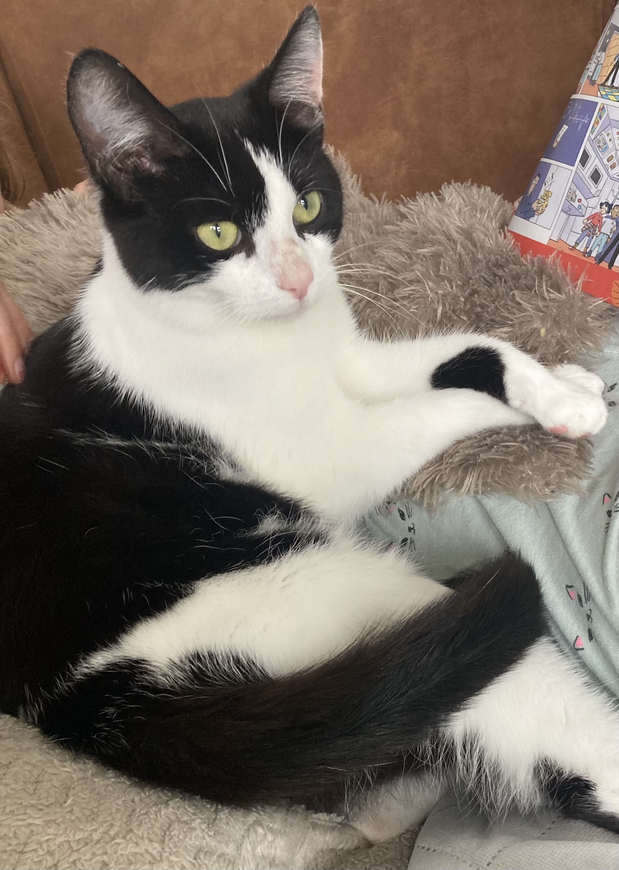 Zwart-witte poes met zwart vlekje bij de linkervoorpoot (zie foto).