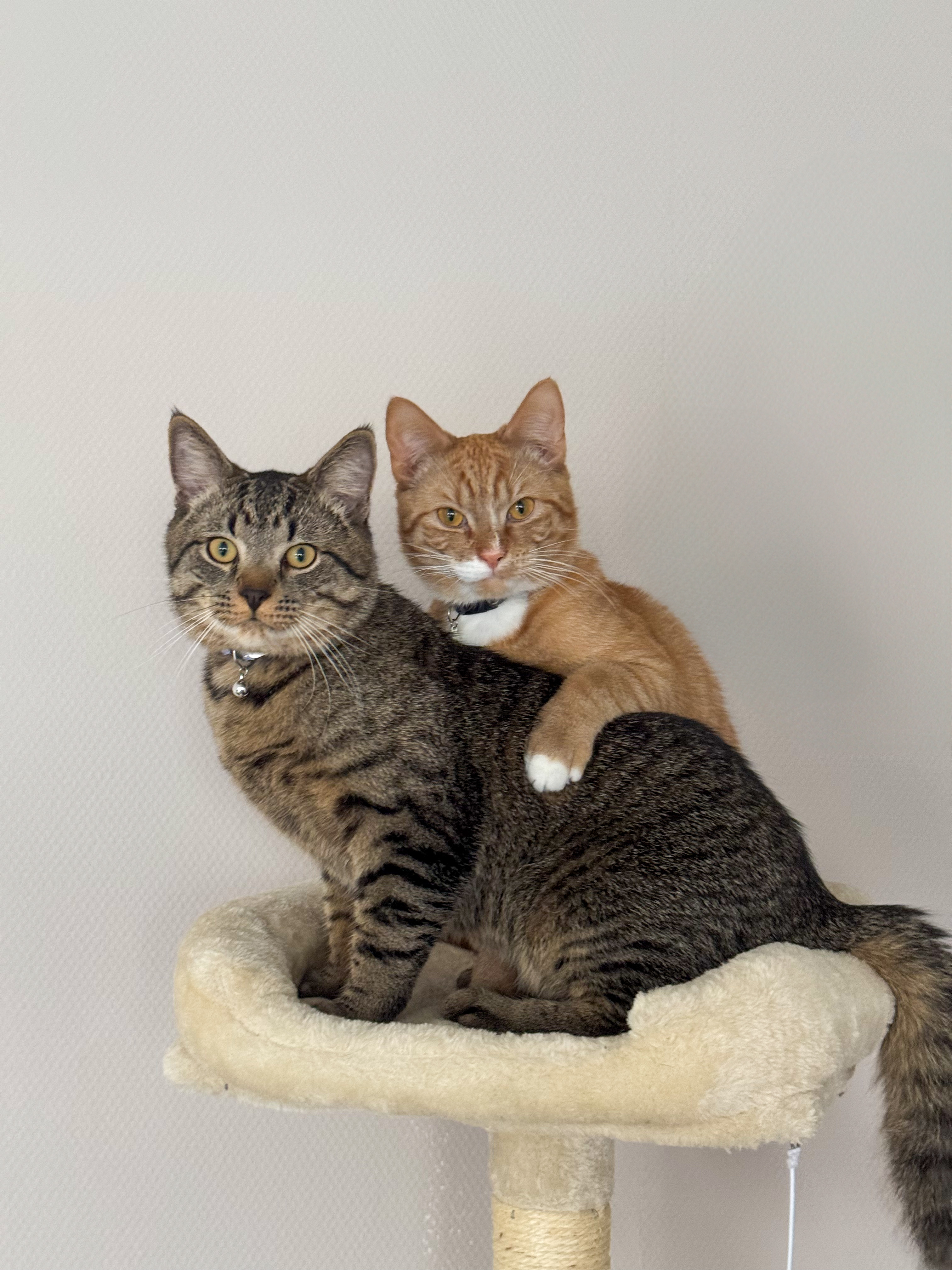 Lieve kat die geen vlieg kwaad doet beetje tijgerachtige streepjes over zijn lichaam (linker kat op de foto). Kat draagt GEEN halsbandje