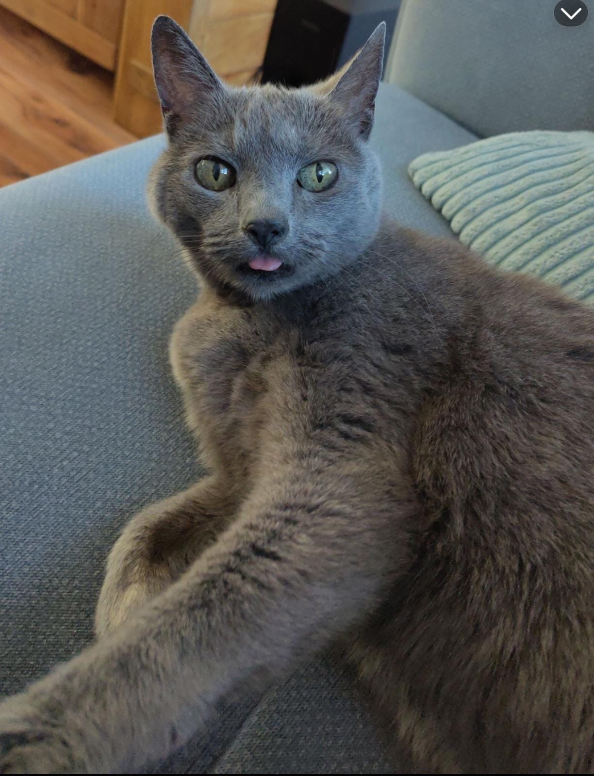 Volledige grijze poes. Simba is 18 jaar oud. Loopt lichtelijk mank bij de voorpoten en heeft een wat schorre mauw