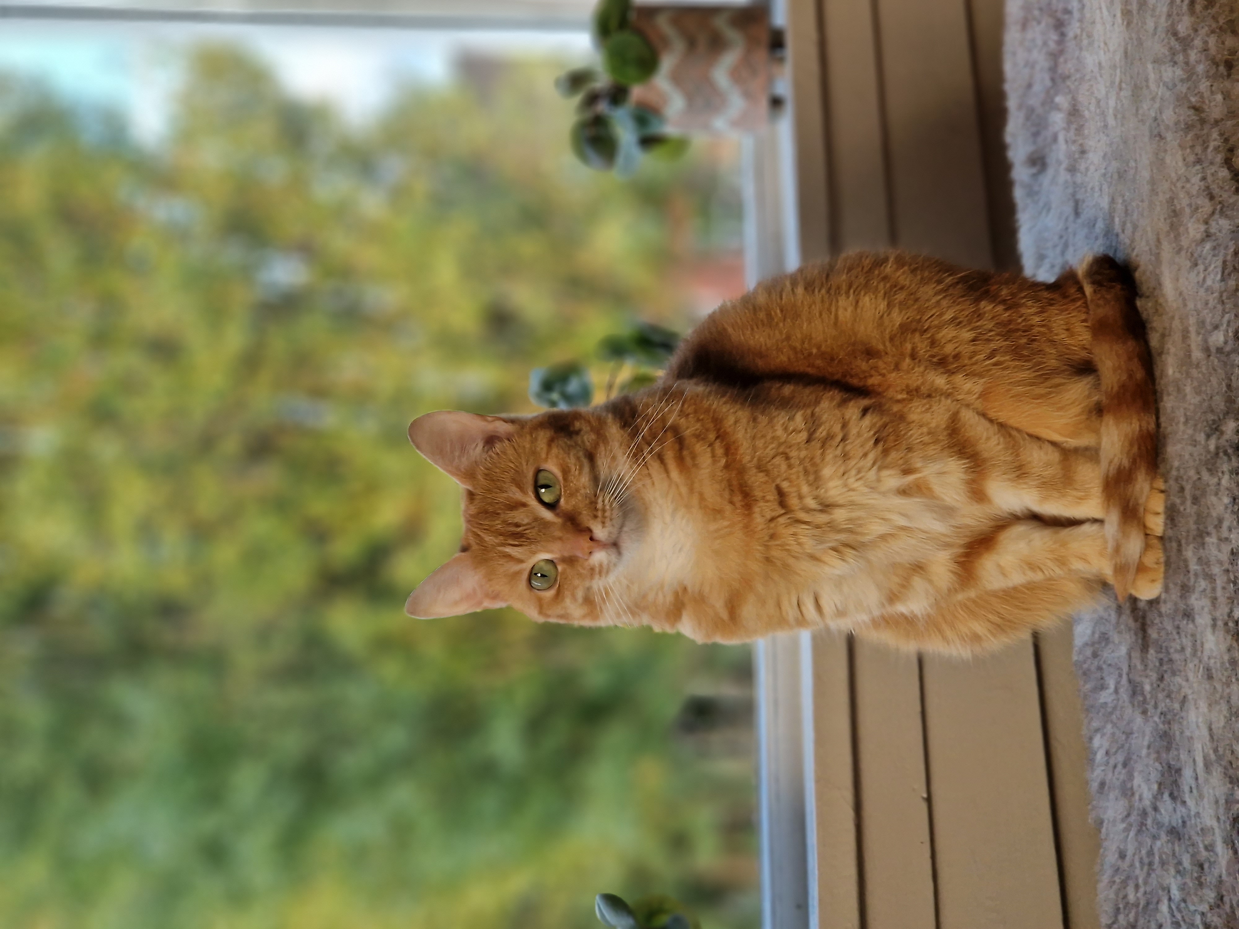 Oranje poes met witte hals. Klein van postuur. Groene ogen.