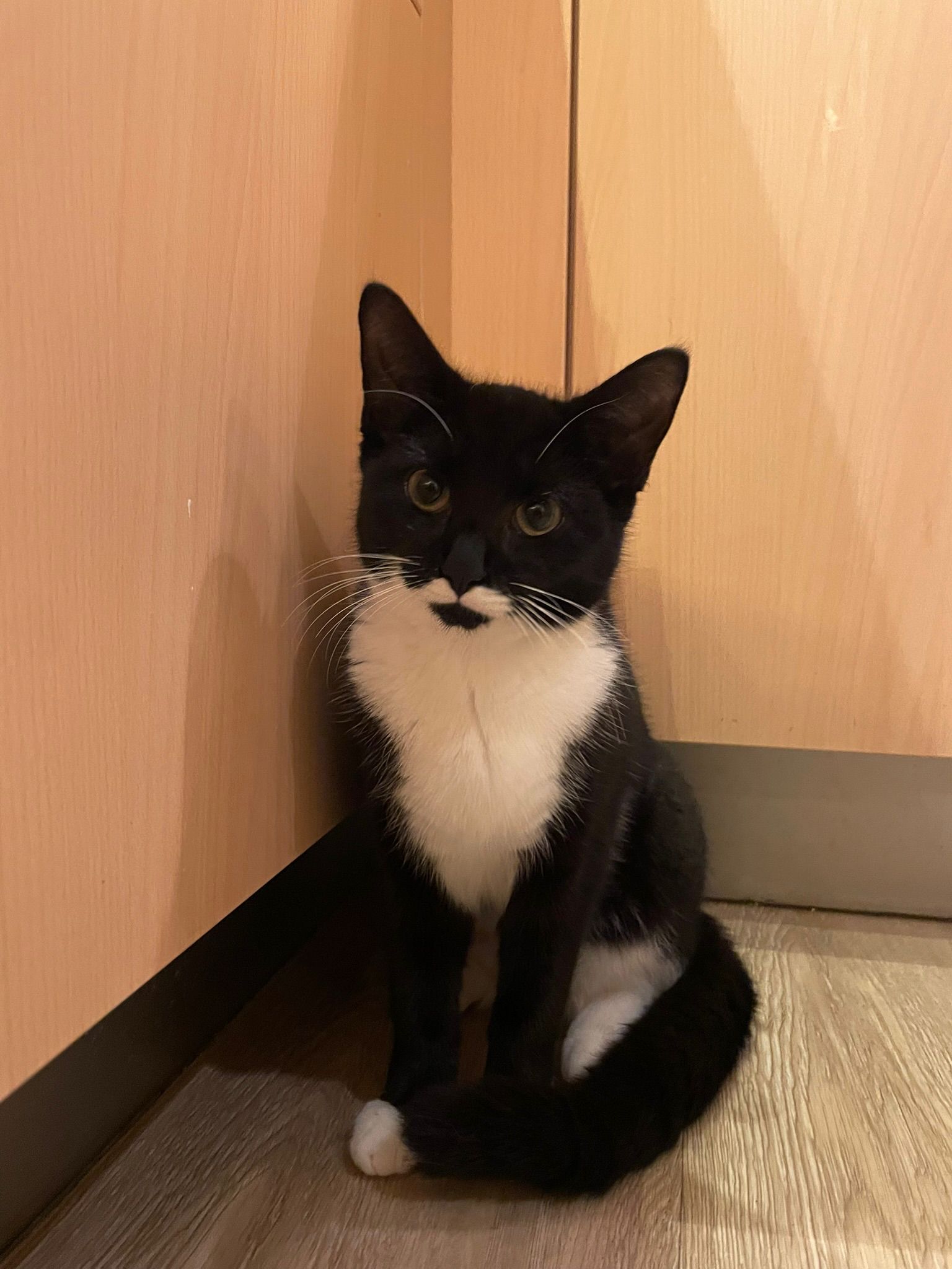 Zwarte kat met witte kraag, borst en sokjes. Klein en slank