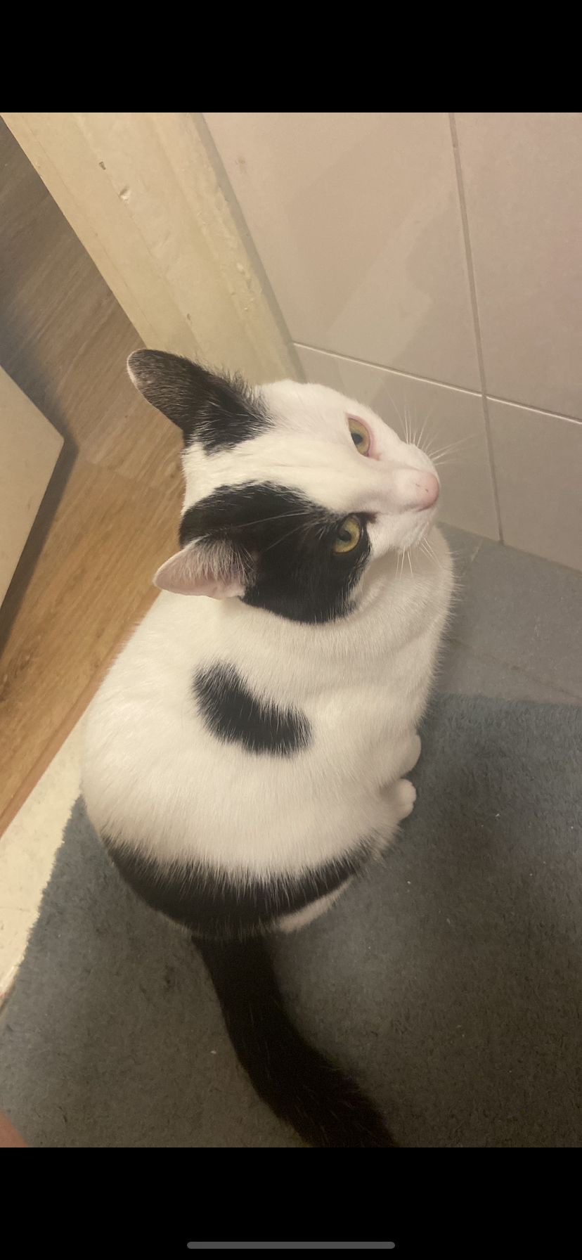 Lulu is een witte kater met zwarte vlekken. Hij is een binnenkat en dus niet gewend om buiten te zijn.
