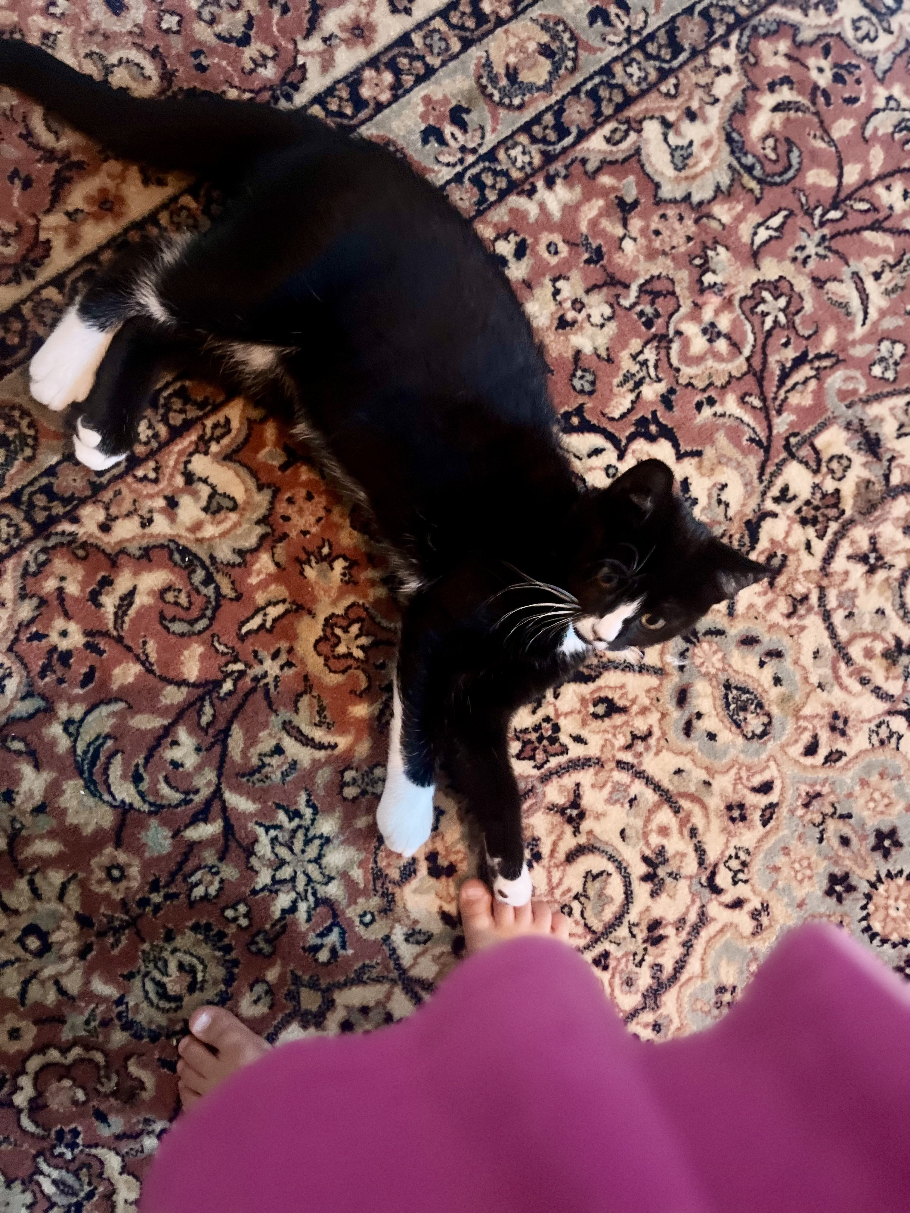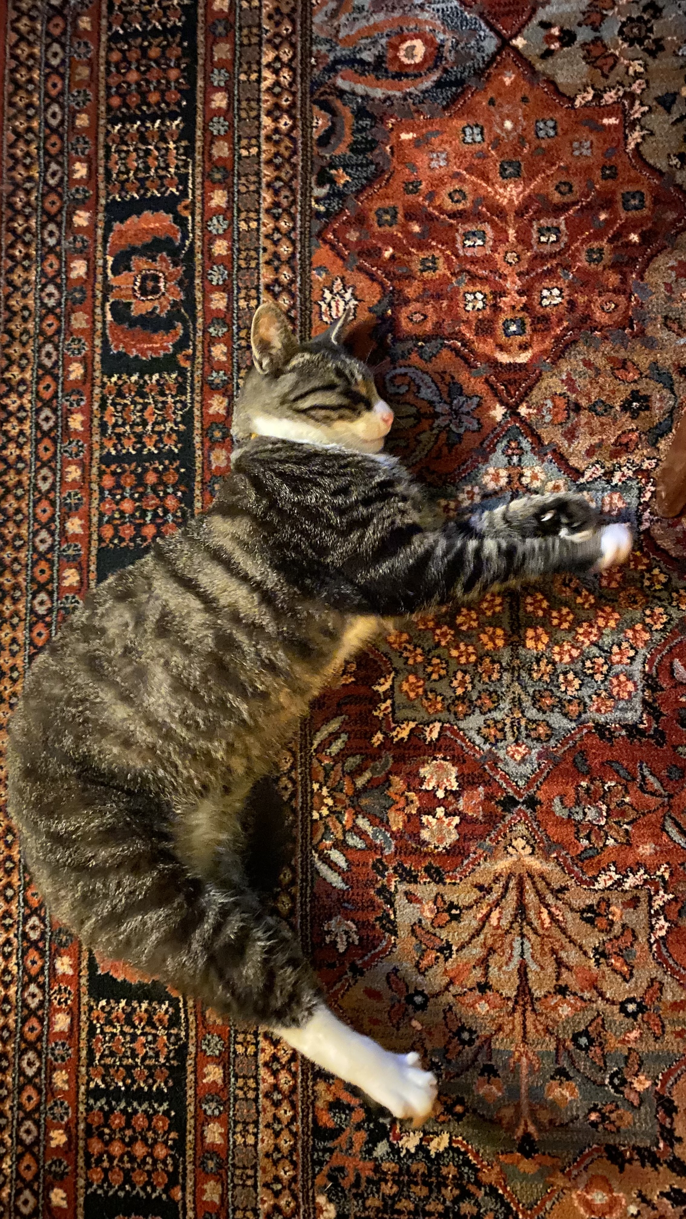 Blauwe rus met geelgroene ogen, houdt haar staart gekruld als ze loopt. Heel lief en een beetje schuw