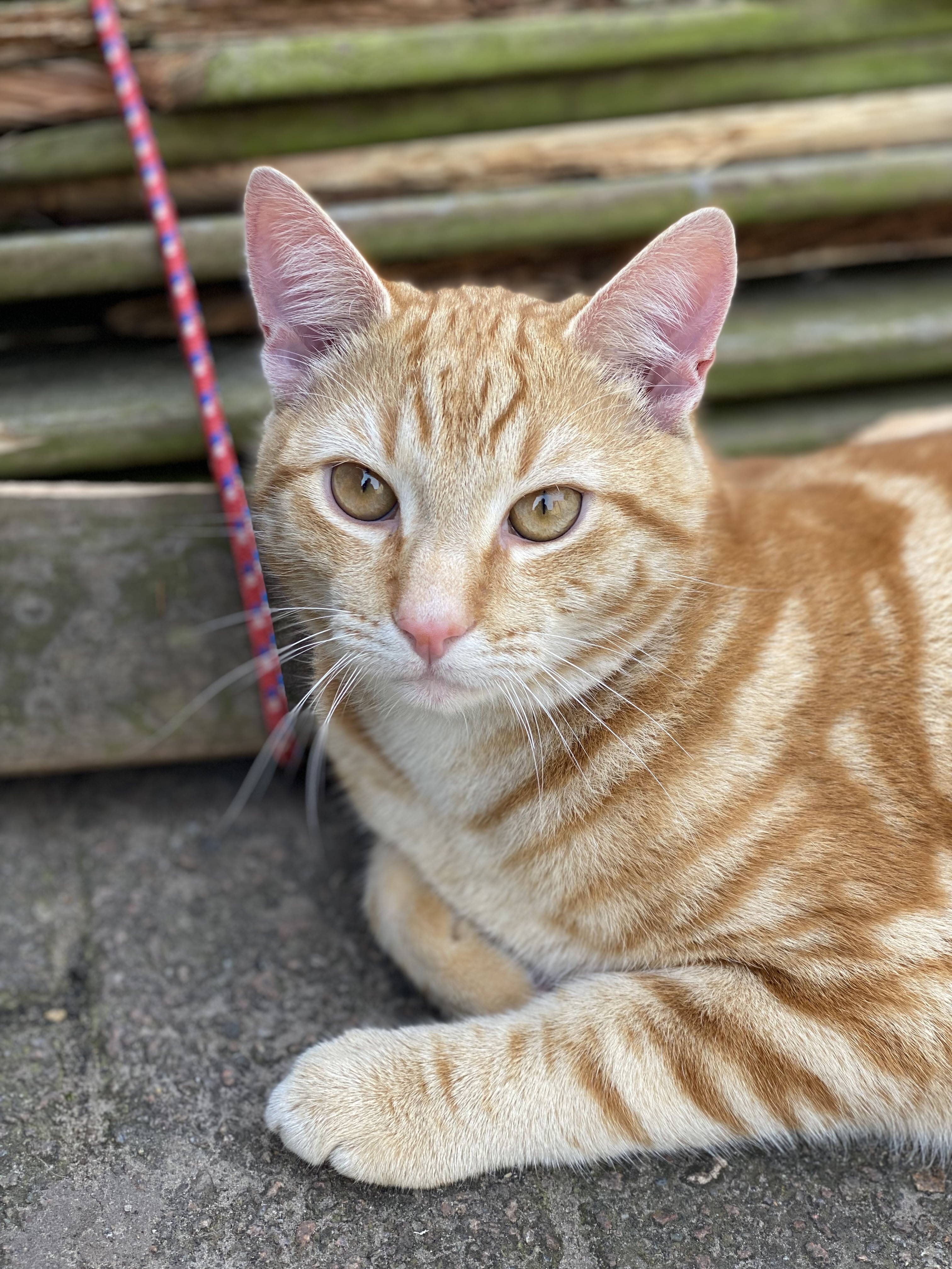 Cyperse rood oranje forse kater, jong volwassen, ruitvormige witte bef, amberkleurige poten, met een paar witte tenen.