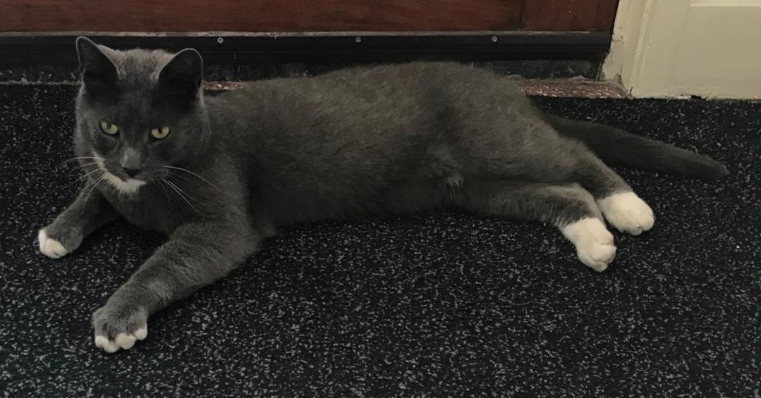 Grijs met een witte bef en witte sokjes aan alle voer de pootjes