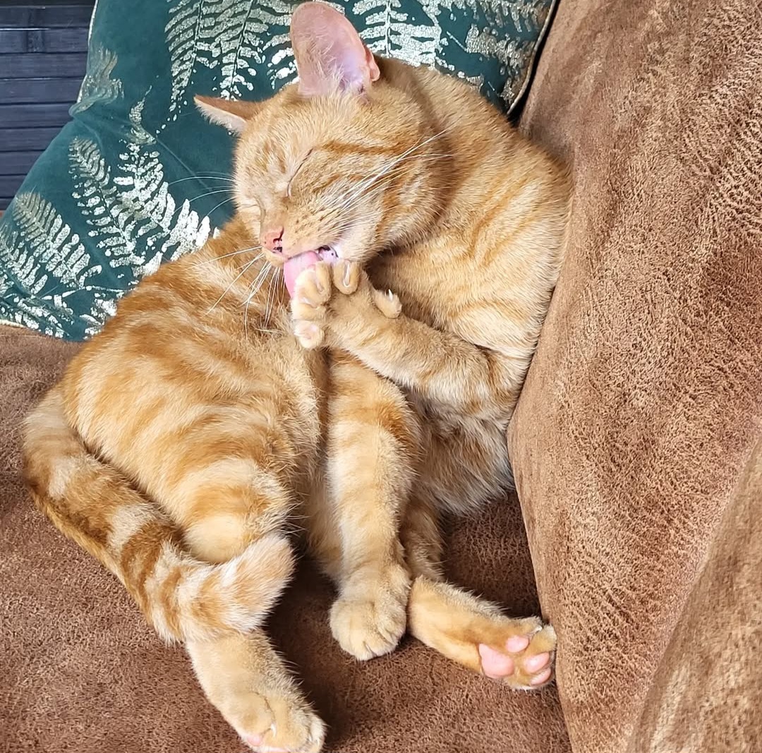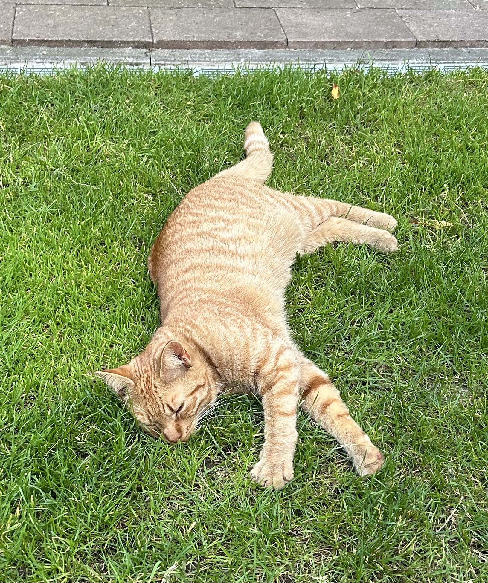 Gemiddelde rode kater. Met donker rode strepen. Aanhankelijk en luisterd goed naar de naam. Recent aan 1 pootje geschoren daar is het haar nog niet helemaal terug gegroeit.
