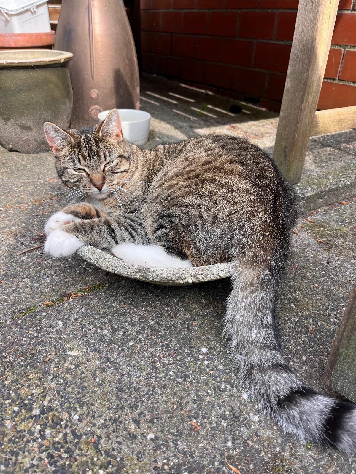Tabby grijs. Zwart op rug. Witte voetjes. Slanke lange kat, rechter oor heeft hap eruit.