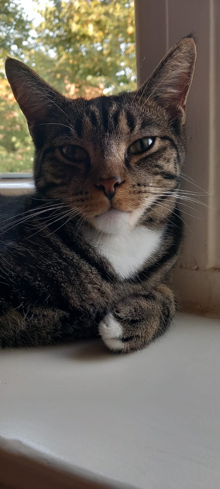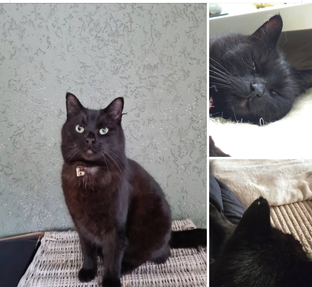 Hij is 6 maanden oud, heeft een best grote zwarte vlek op zijn snuit. Is een binnen kat maar is uit het raam gesprongen toen deze op een kiertje stond (zit een hor doek voor)